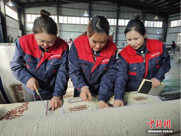 阿爾孜古麗(右一)在生產(chǎn)線上查看地毯編織流程工藝。閆兆霞 攝