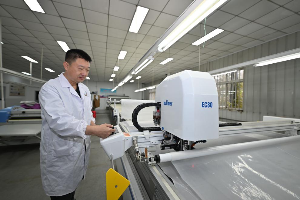 工人在天津紡織集團(tuán)(控股)有限公司智能化生產(chǎn)車(chē)間內(nèi)操作自動(dòng)切布機(jī)。新華社記者孫凡越 攝