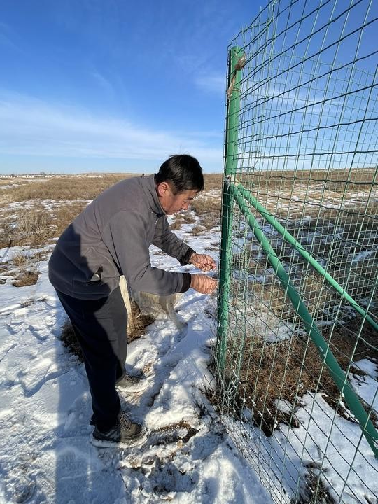高萬東在修復(fù)損壞的長(zhǎng)城保護(hù)圍欄。新華社發(fā)