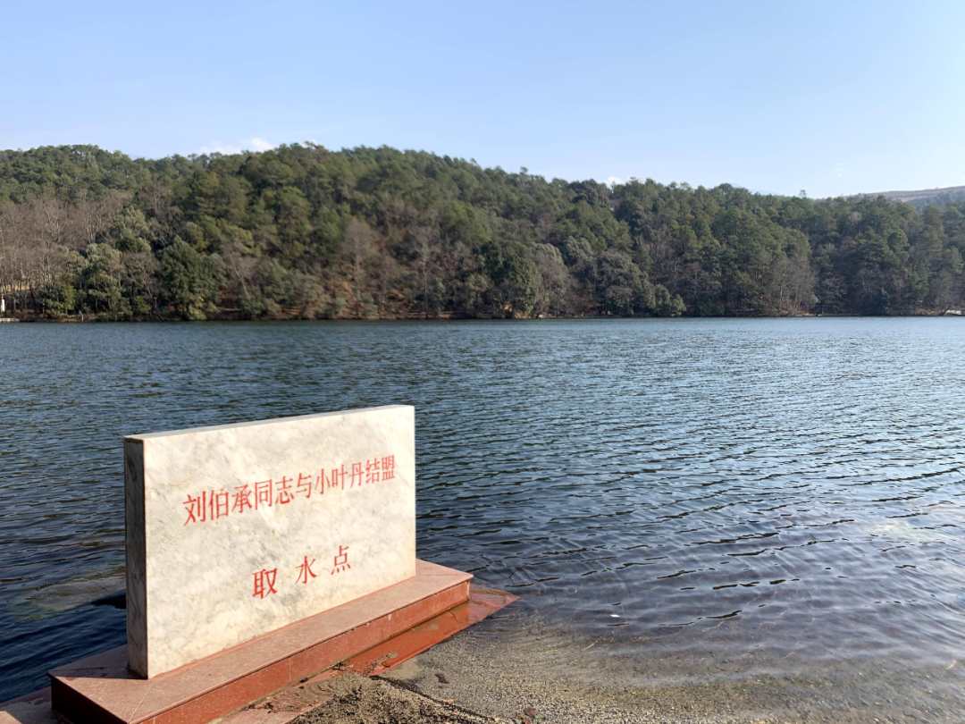 如今,取水處立有一塊白色石碑,上書“劉伯承同志與小葉丹結(jié)盟取水點(diǎn)”字樣。取水點(diǎn)不遠(yuǎn)處,彝海結(jié)盟的三塊石頭仍然保留。當(dāng)年劉伯承年長(zhǎng),坐在北面稍高的石頭上,小葉丹與他相向而坐,彝族畢摩(祭司)沙馬爾各則坐在中間的石頭上主持結(jié)盟儀式。