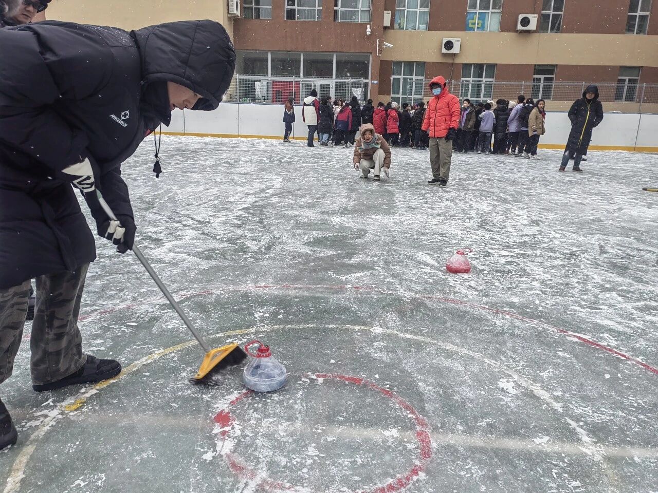 克拉瑪依市第五小學師生自制“冰壺”,在校園進行比賽??死斠朗械谖逍W 供圖