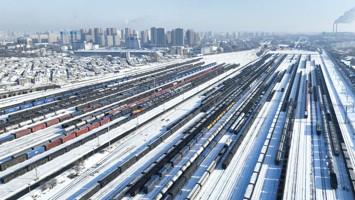 裝滿物資的貨運(yùn)列車(chē)在黑龍江省哈爾濱南站編組站場(chǎng)整裝待發(fā)?!叭拧碧煲詠?lái),針對(duì)北方降溫降雪天氣,中國(guó)鐵路哈爾濱局集團(tuán)有限公司哈爾濱南站積極開(kāi)展電煤、生產(chǎn)物資保供專項(xiàng)行動(dòng),全力保障民生物資運(yùn)輸需求(2026年1月15日攝,無(wú)人機(jī)照片)。新華社發(fā)(原勇 攝)