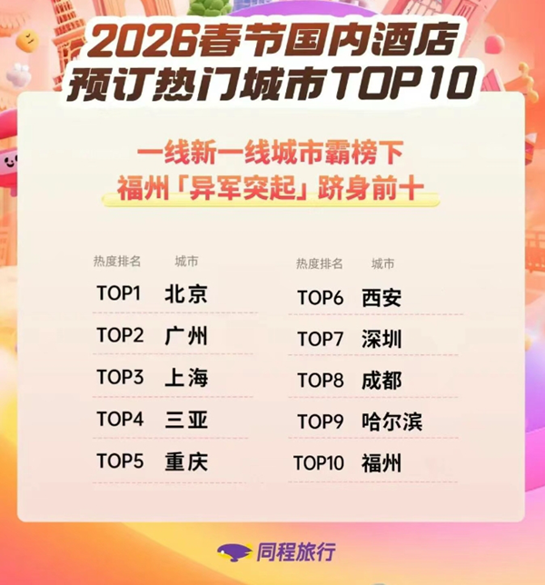 同程旅行數據顯示,春節(jié)國內酒店預訂熱門城市TOP10榜單,基本被一線、新一線城市霸榜,但“國家歷史文化名城”福建福州闖出一席之地,躋身第10名。2025年,三坊七巷、煙臺山、上下杭等3個街區(qū)全年接待游客超5500萬人次,創(chuàng)歷史新高。