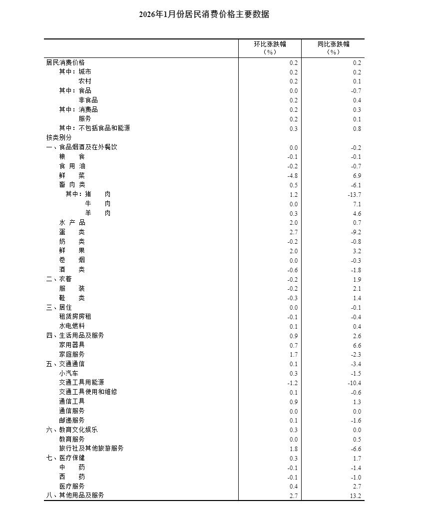 2026年1月份,全國居民消費價格同比上漲0.2%。其中,城市上漲0.2%,農(nóng)村上漲0.1%;食品價格下降0.7%,非食品價格上漲0.4%;消費品價格上漲0.3%,服務(wù)價格上漲0.1%。