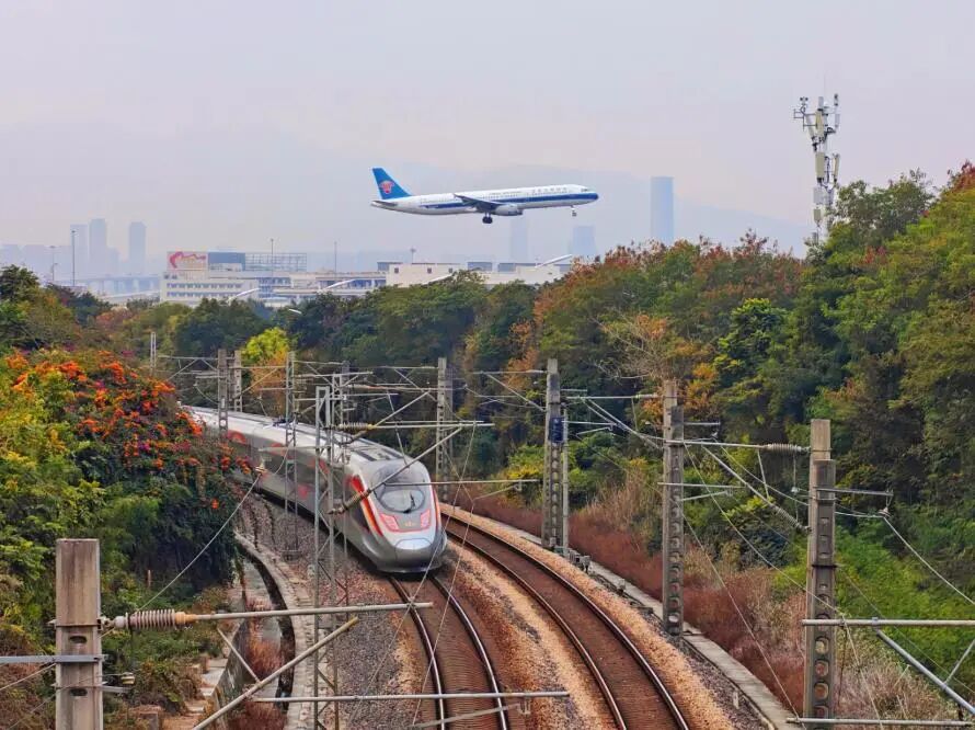 廈門島內(nèi)鷹廈線路上,紅色復(fù)興號(hào)與藍(lán)色飛機(jī)同框。