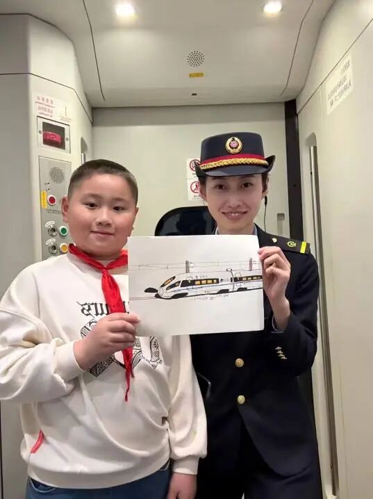 系著紅領(lǐng)巾的小旅客,雙手捧著一幅自己手繪的高鐵畫,遞到了列車長(zhǎng)面前。畫面上的列車線條流暢、細(xì)節(jié)生動(dòng),黑黃相間的車身仿佛正帶著少年的憧憬向前飛馳。列車長(zhǎng)笑著接過(guò)這份沉甸甸的心意,與少年并肩站在一起,共同舉起畫作。