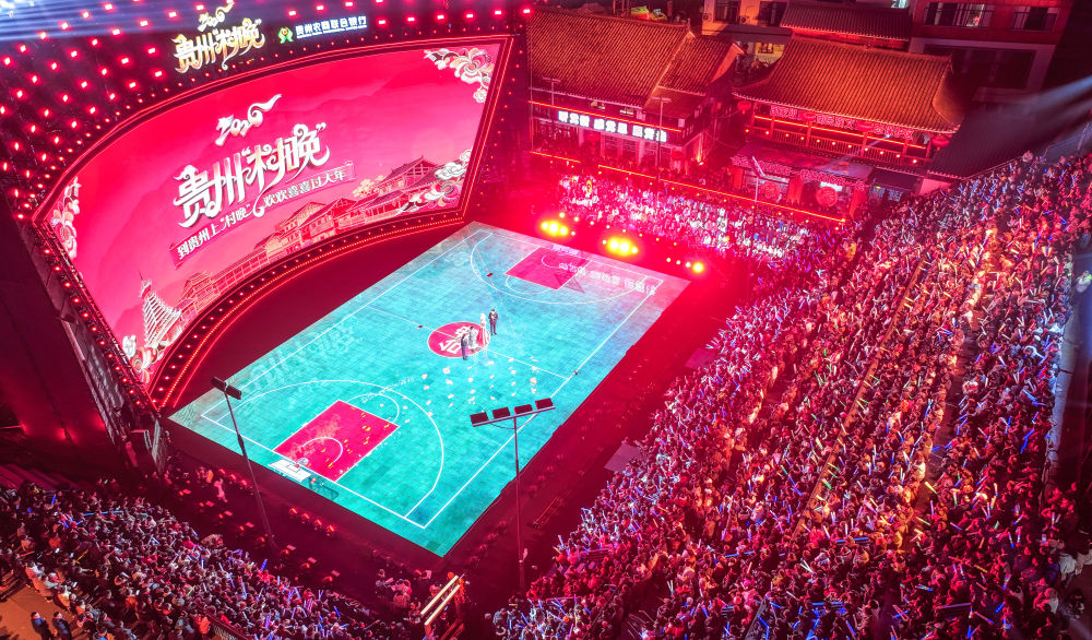 2月3日,觀眾在臺江縣臺盤鄉(xiāng)“村BA”球場觀看貴州“村晚”(無人機照片)。新華社記者 楊文斌 攝