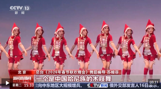 總臺《2026年春節(jié)聯(lián)歡晚會》舞蹈編導(dǎo) 蘇婭菲:這次的作品中有中國的兩個不同的舞種,一個是哈尼族的木屐舞,一個是中國傈僳族的阿尺木刮,它也是國家級非遺。還有兩支來自國外不同的團(tuán)隊,一個來自匈牙利,表演的是匈牙利的萊蓋涅什,是他們的傳統(tǒng)民族舞蹈,一個是西班牙的一支舞蹈團(tuán),表演的就是弗拉門戈。