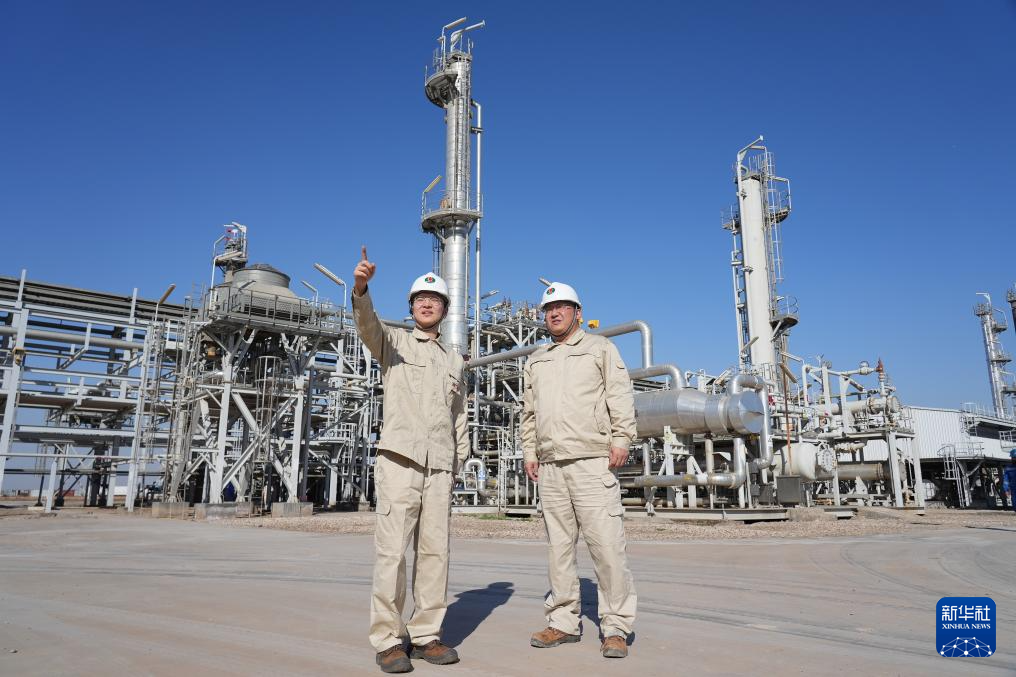 2月16日,在伊拉克瓦西特省,中國綠洲石油公司計劃部副經(jīng)理劉學(xué)(左)在艾哈代布油田中心處理站巡檢。新華社記者 段敏夫 攝