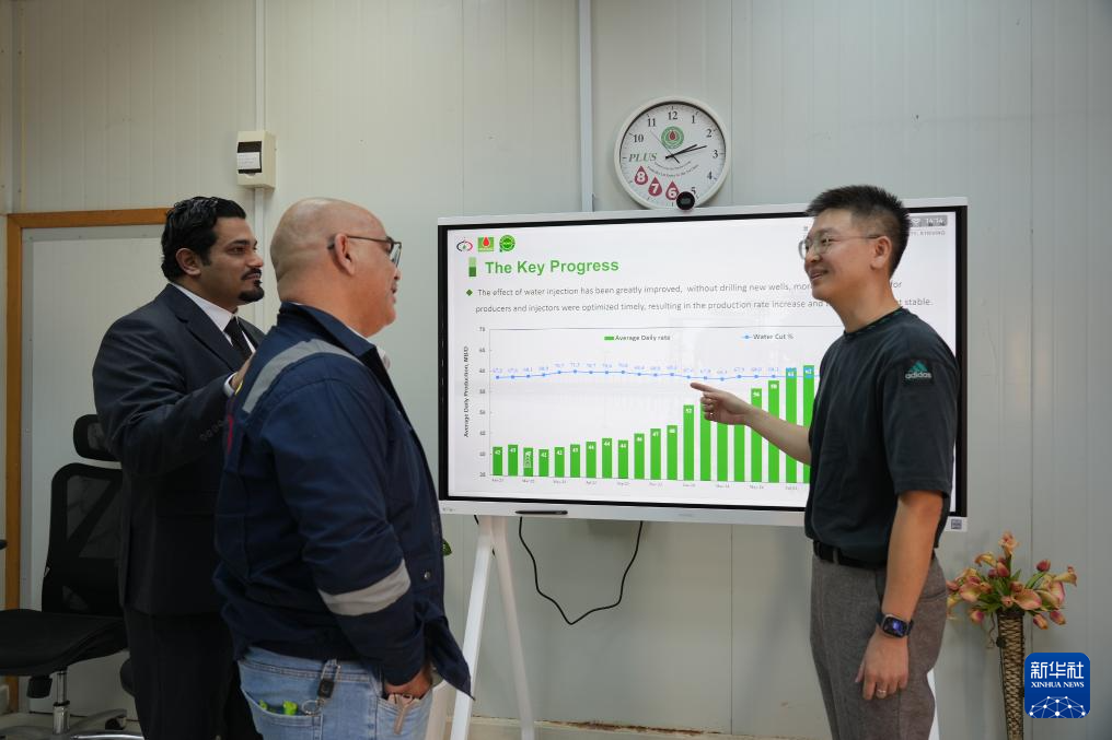 2月16日,在伊拉克瓦西特省艾哈代布油田,中國綠洲石油公司計劃部副經(jīng)理劉學(xué)(右一)與伊拉克合作伙伴梳理生產(chǎn)經(jīng)營任務(wù)完成情況。新華社記者 段敏夫 攝