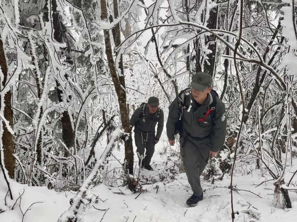 筒靴有點大,走起路來鞋底有些打滑,但踩進深深的雪地里確實不濕腳了。王偉已經(jīng)在山里摸爬滾打了七年,毛軍剛入職一年,兩個人是巡山的“搭檔”。一人負責巡護,另一人則負責科研,是站里常見的組合。