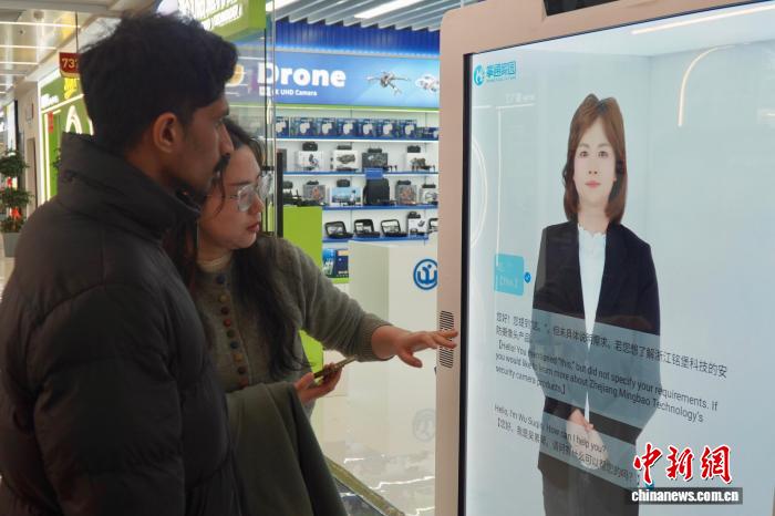 2月28日,浙江義烏,中外客商在店鋪門前與多語種數(shù)字人對(duì)話。董易鑫 攝