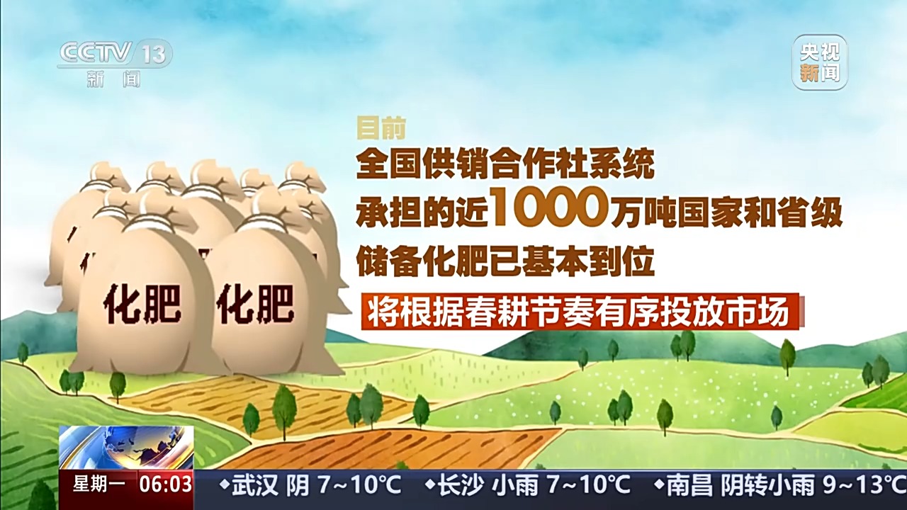 目前,全國供銷合作社系統(tǒng)承擔(dān)的近1000萬噸國家和省級(jí)儲(chǔ)備化肥已基本到位,將根據(jù)春耕節(jié)奏有序投放市場。
