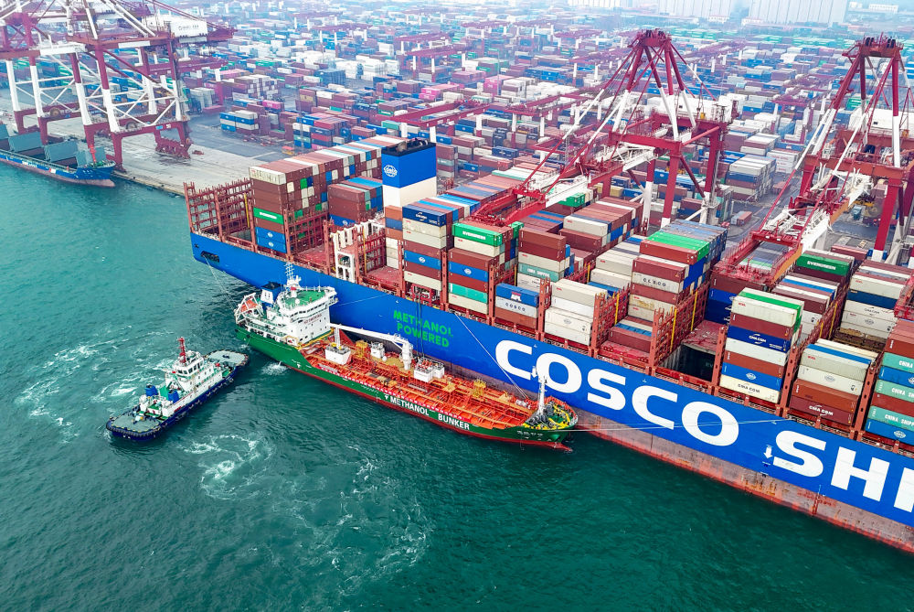 3月2日,在山東港口青島港,甲醇加注船“建航利達(dá)”輪為一艘貨輪進(jìn)行綠色甲醇“船對(duì)船”加注作業(yè)(無人機(jī)照片)。新華社發(fā)(張進(jìn)剛攝)