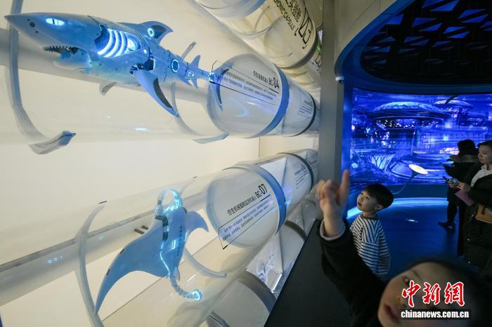 1月30日,游客在位于天津濱海新區(qū)的國家海洋博物館“未來海洋”展廳參觀各種海洋仿生機器人。 中新社記者 佟郁 攝