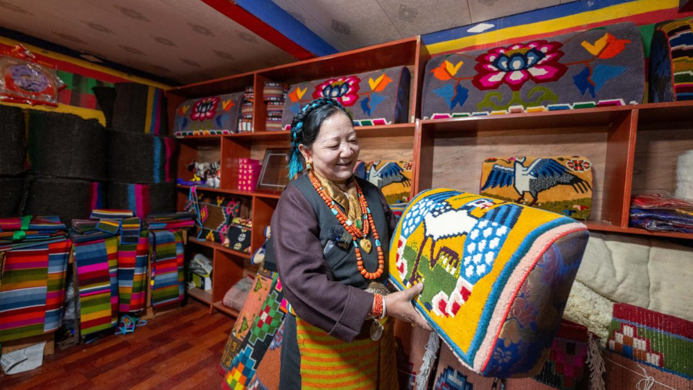 3月25日,西藏日喀則市崗巴縣直克鄉(xiāng)乃村順心合作社負(fù)責(zé)人德吉在介紹藏式靠枕。新華網(wǎng) 旦增努布 攝
