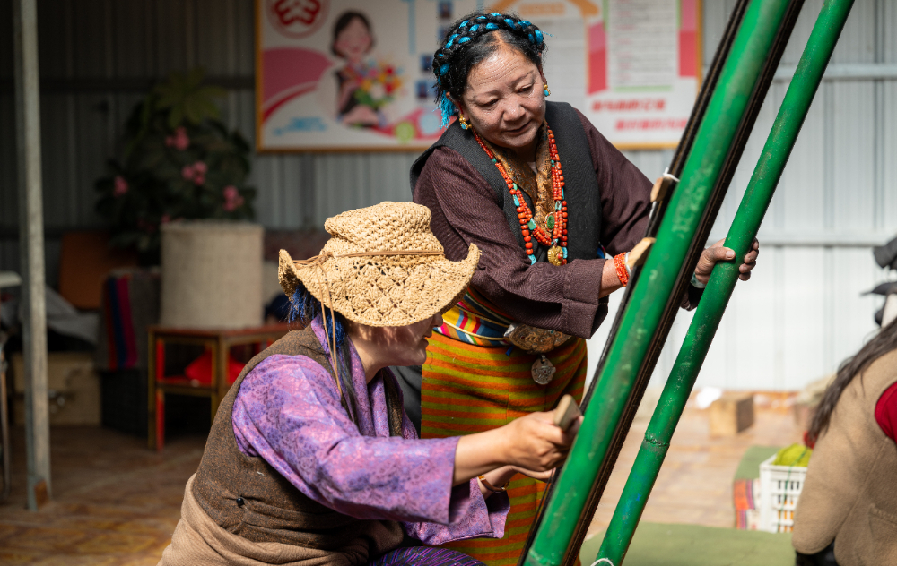 3月25日,西藏日喀則市崗巴縣直克鄉(xiāng)乃村順心合作社負(fù)責(zé)人德吉給員工確吉指導(dǎo)編織技藝。新華網(wǎng) 旦增努布 攝