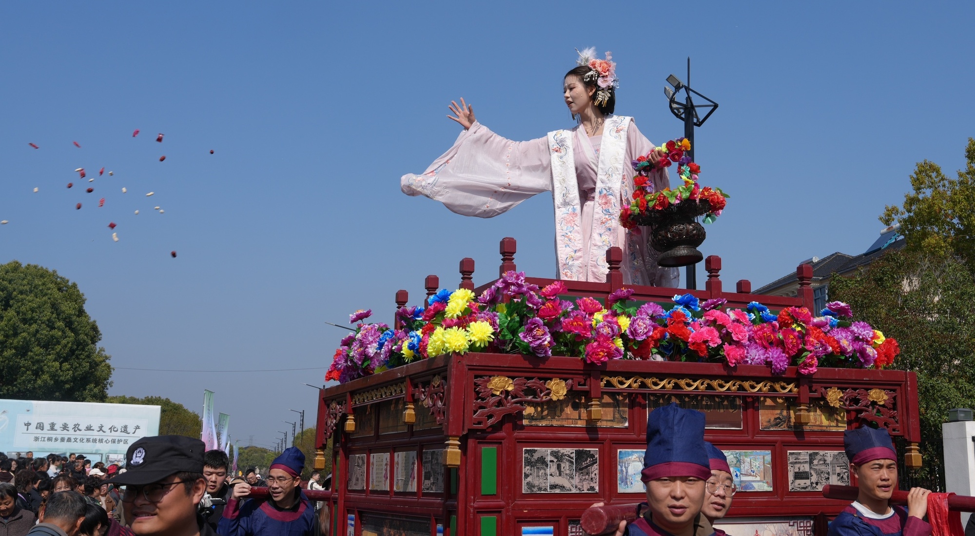 當(dāng)天上午,蠶花“禮”民俗儀式上,每一個環(huán)節(jié)都承載著蠶鄉(xiāng)兒女對風(fēng)調(diào)雨順、蠶花茂盛的美好祈愿。最令人期待的當(dāng)屬民俗巡游展演。來自桐鄉(xiāng)全市各鎮(zhèn)(街道)的民間民俗隊伍浩浩蕩蕩穿行于村道之間;蠶花仙子與十二花神乘花船翩然而至,沿途撒下寄托祝福的蠶花,與游客互動答題。