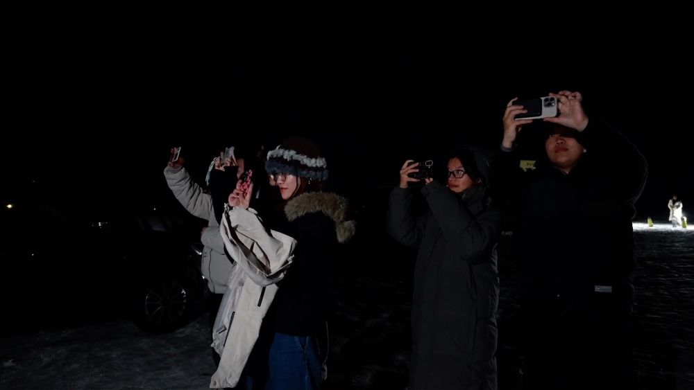 在漠河市北極鎮(zhèn)北極村,雖然夜間室外溫度非常低,卻絲毫沒(méi)有阻擋大批游客追光的熱情。