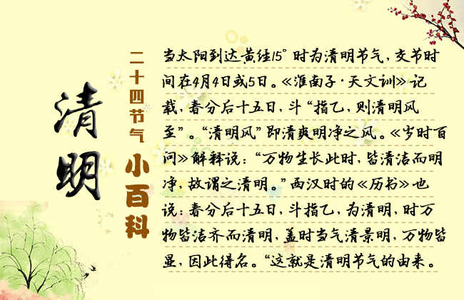 節(jié)選自《二十四節(jié)氣志》/宋英杰 4月5日前后為清明節(jié)氣,氣清景明之意,正是鳥語花香的盛春時(shí)節(jié)。“言萬物去故而從新,莫不鮮明之謂也?!薄叭f物生長(zhǎng)此時(shí),皆清凈明潔,故謂之清明?!鼻迕髦惚碚髁诉@一時(shí)節(jié)的天氣是清新、明媚、和暖的。