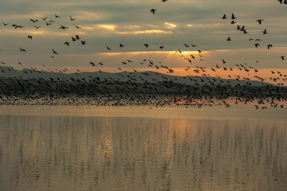 夕陽(yáng)下,大雁群在吉林省琿春市敬信濕地翱翔。新華社發(fā)(郎鵬 攝)