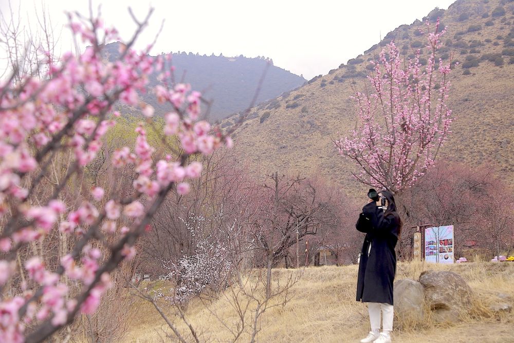 全國(guó)各地游客慕名前來(lái)觀賞。廣東省茂名市的張曉夫婦,開(kāi)車自駕3000多公里,只為到此一睹桃花盛景。