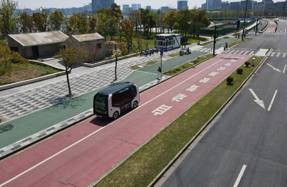 在中國(guó)(上海)自由貿(mào)易試驗(yàn)區(qū)臨港新片區(qū),一輛無(wú)人駕駛汽車(chē)行駛在自動(dòng)駕駛測(cè)試專(zhuān)用路上(無(wú)人機(jī)照片,2024年4月9日攝)。
