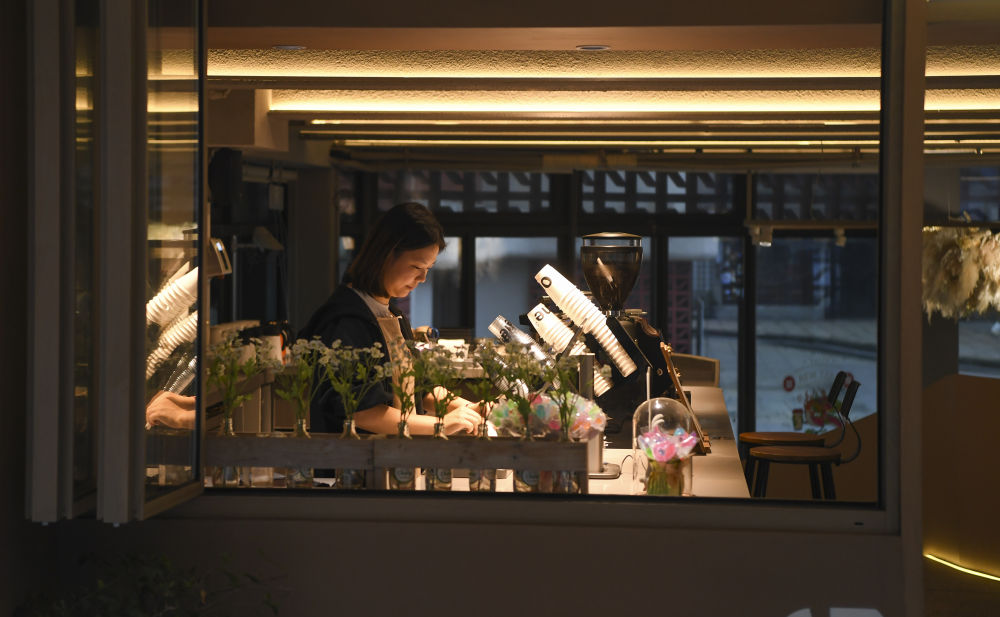 2024年4月22日,在重慶市九龍坡區(qū)謝家灣街道民主村社區(qū),飲品店工作人員在店內忙碌。