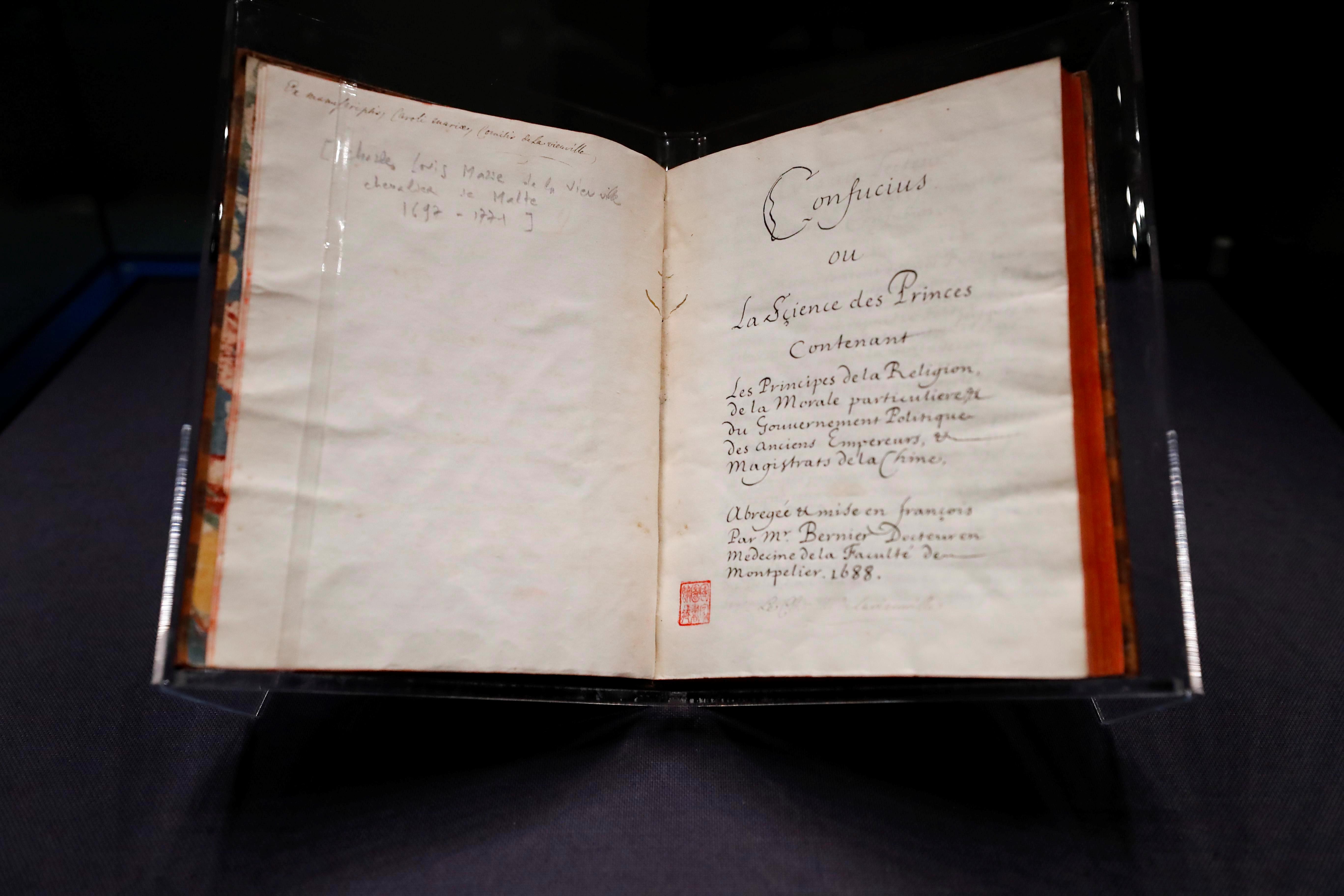 1688年,首部《論語導讀》法文版原著正式出版。牛皮封面、飄口燙金、染紋紙環(huán)襯、書口刷紅……這是一本富有法國啟蒙時期書籍裝幀特征的古老典籍,世界上僅存兩本。
