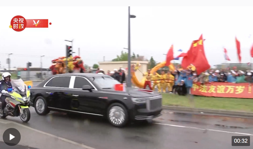 當(dāng)?shù)貢r間5月5日下午,國家主席習(xí)近平乘專機(jī)抵達(dá)巴黎。從機(jī)場前往下榻酒店途中,包括華人華僑和中國留學(xué)生代表在內(nèi)的歡迎人群揮舞著中法兩國國旗,敲鑼打鼓,舞龍舞獅,熱烈歡迎習(xí)近平主席到訪。