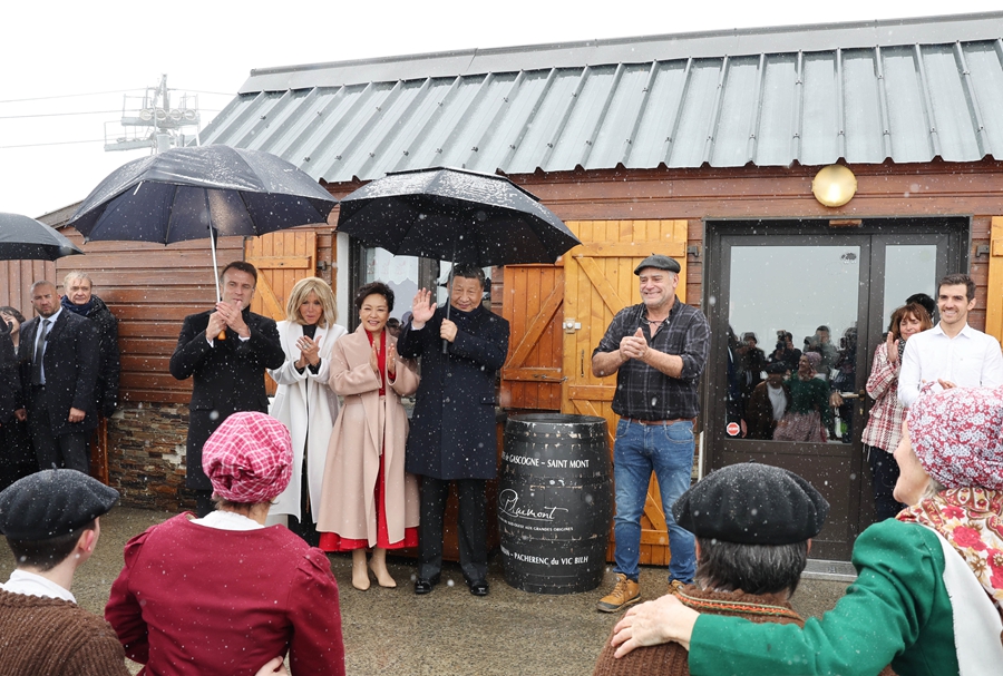 當(dāng)?shù)貢r(shí)間5月7日,應(yīng)法國總統(tǒng)馬克龍?zhí)貏e邀請(qǐng),國家主席習(xí)近平乘專機(jī)來到法國西南部上比利牛斯省訪問。在圖爾馬萊山口“牧羊人驛站”,習(xí)近平和夫人彭麗媛同馬克龍和夫人布麗吉特共同欣賞當(dāng)?shù)卮迕癖硌莸木哂袧庥裟戏L(fēng)情的牧羊人之舞。新華社記者 姚大偉 攝