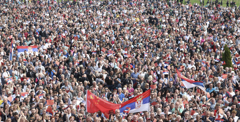 大廈廣場上,一萬五千名塞爾維亞民眾揮舞中塞兩國國旗,對習近平表示最熱烈的歡迎。