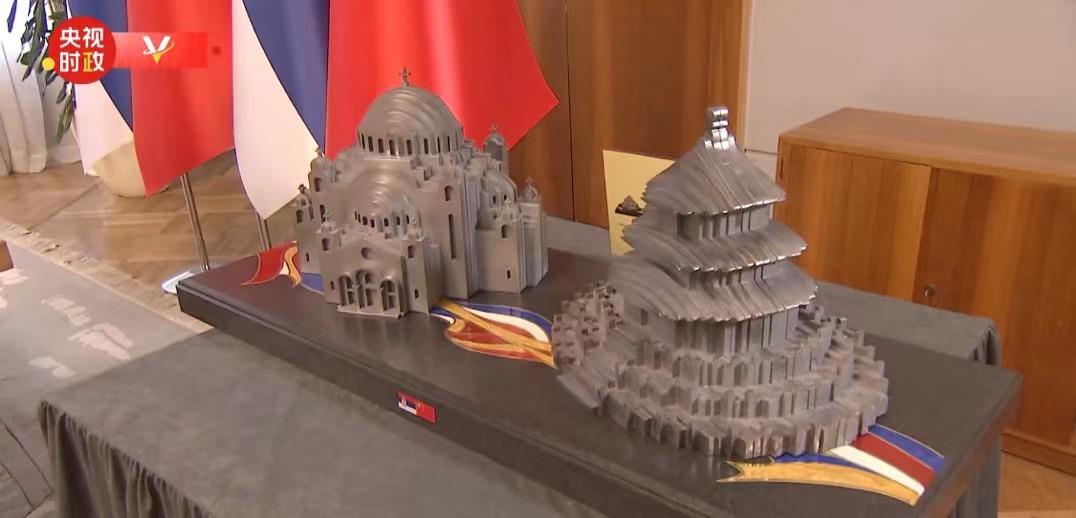這份禮物是北京天壇和貝爾格萊德圣薩瓦教堂造型的鋼制工藝品,由中國(guó)河鋼集團(tuán)斯梅戴雷沃鋼廠生產(chǎn)的鋼材制成。望著這份禮物,習(xí)主席風(fēng)趣地說(shuō),是“鋼桿”朋友了。