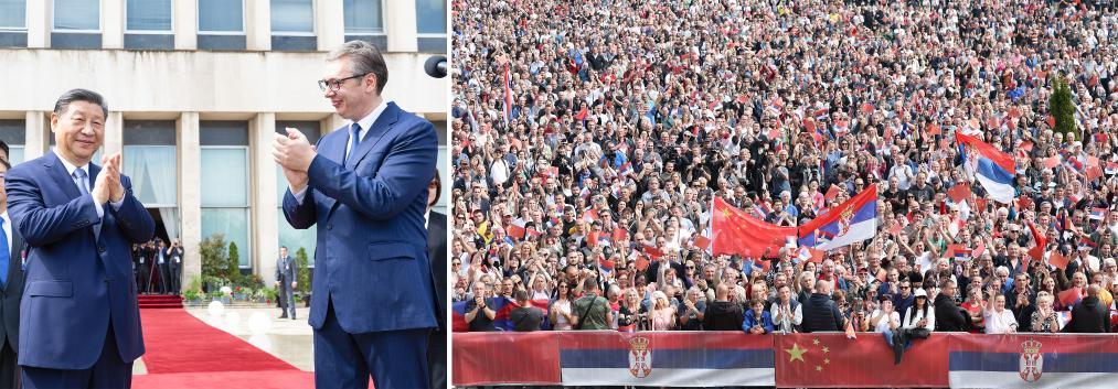 “習(xí)近平主席,我想告訴您的是,您受到全世界人民的尊重,塞爾維亞人民對您的愛戴是發(fā)自肺腑的?!比麪柧S亞總統(tǒng)武契奇在歡迎儀式上說。上萬人的歡迎人群中,豎起緊緊連在一起的五星紅旗和塞爾維亞國旗,是中塞鐵桿情誼的生動見證。