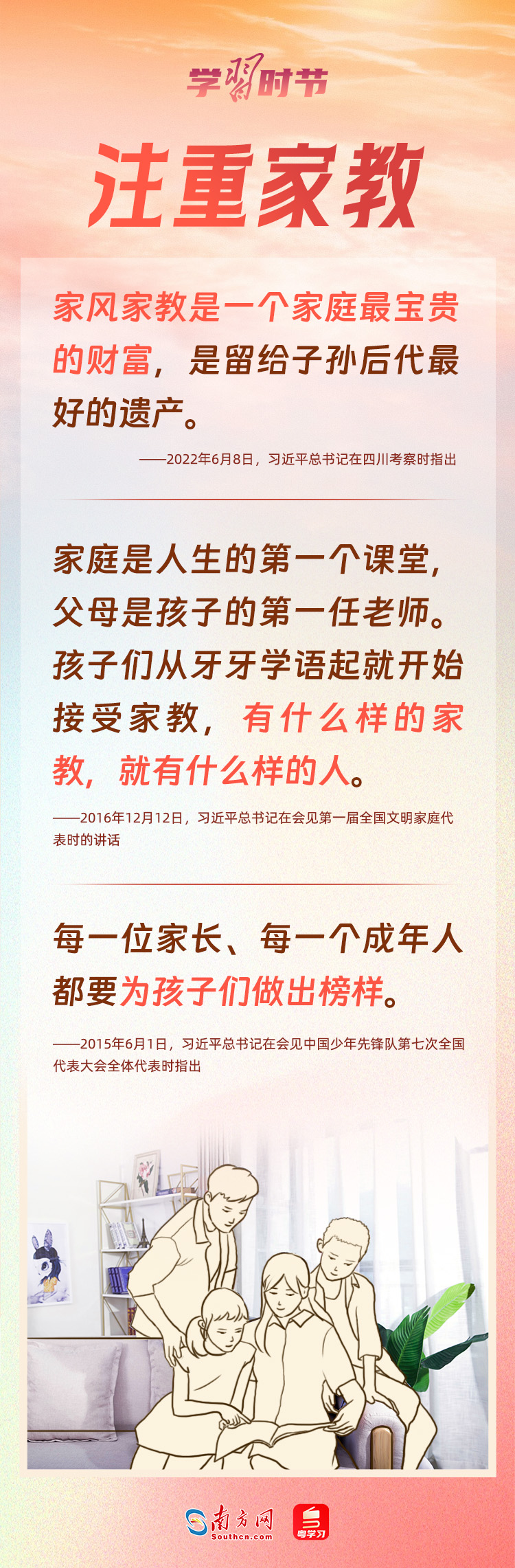 5月15日是國(guó)際家庭日。家庭是社會(huì)的細(xì)胞,是國(guó)家發(fā)展、民族進(jìn)步、社會(huì)和諧的重要基點(diǎn)。習(xí)近平總書(shū)記心中始終牽掛著千家萬(wàn)戶,高度重視家庭、家教和家風(fēng)建設(shè),強(qiáng)調(diào)不論時(shí)代發(fā)生多大變化,不論生活格局發(fā)生多大變化,我們都要重視家庭建設(shè),注重家庭、注重家教、注重家風(fēng)。家庭和睦、家教良好、家風(fēng)端正,子女才能健康成長(zhǎng),社會(huì)才能健康發(fā)展。