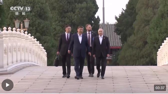 習(xí)近平在瀛臺(tái)橋前迎接普京。兩國元首邊走邊談,看亭臺(tái)樓榭,賞萬物并秀。