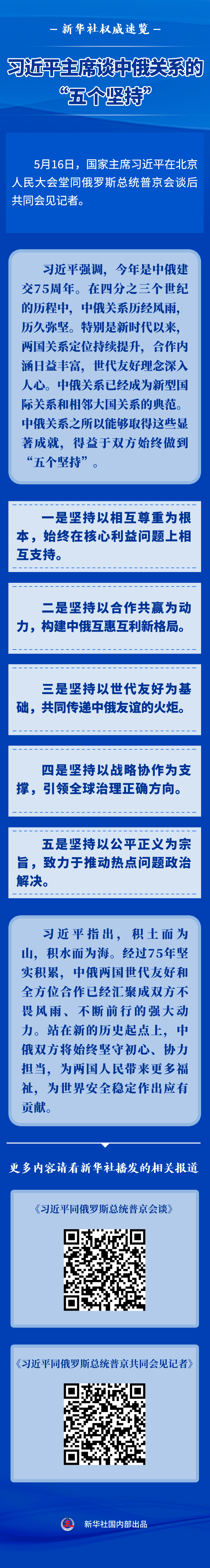 5月16日,國家主席習近平在北京人民大會堂同俄羅斯總統(tǒng)普京會談后共同會見記者。習主席談到中俄關系的“五個堅持”。