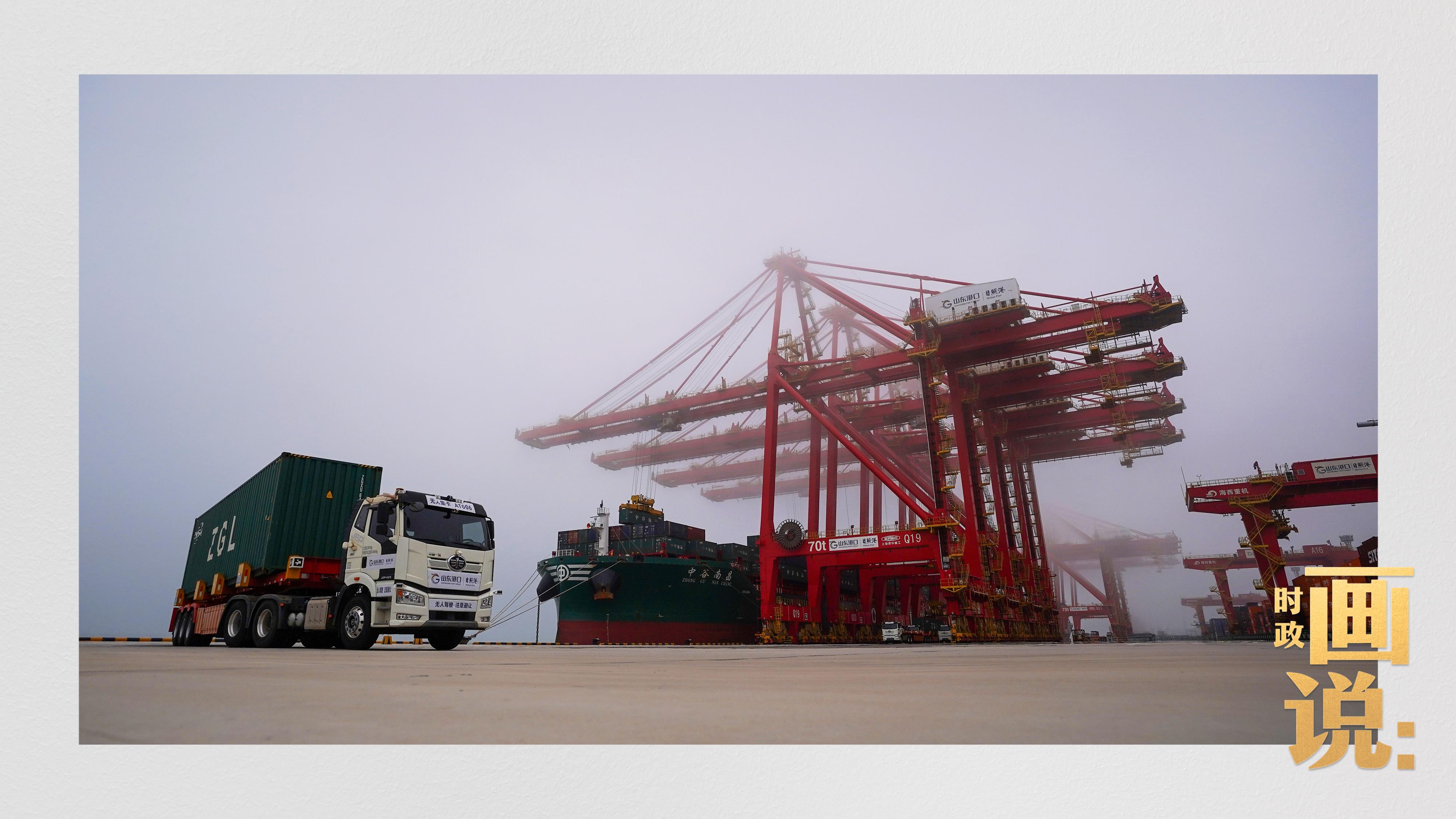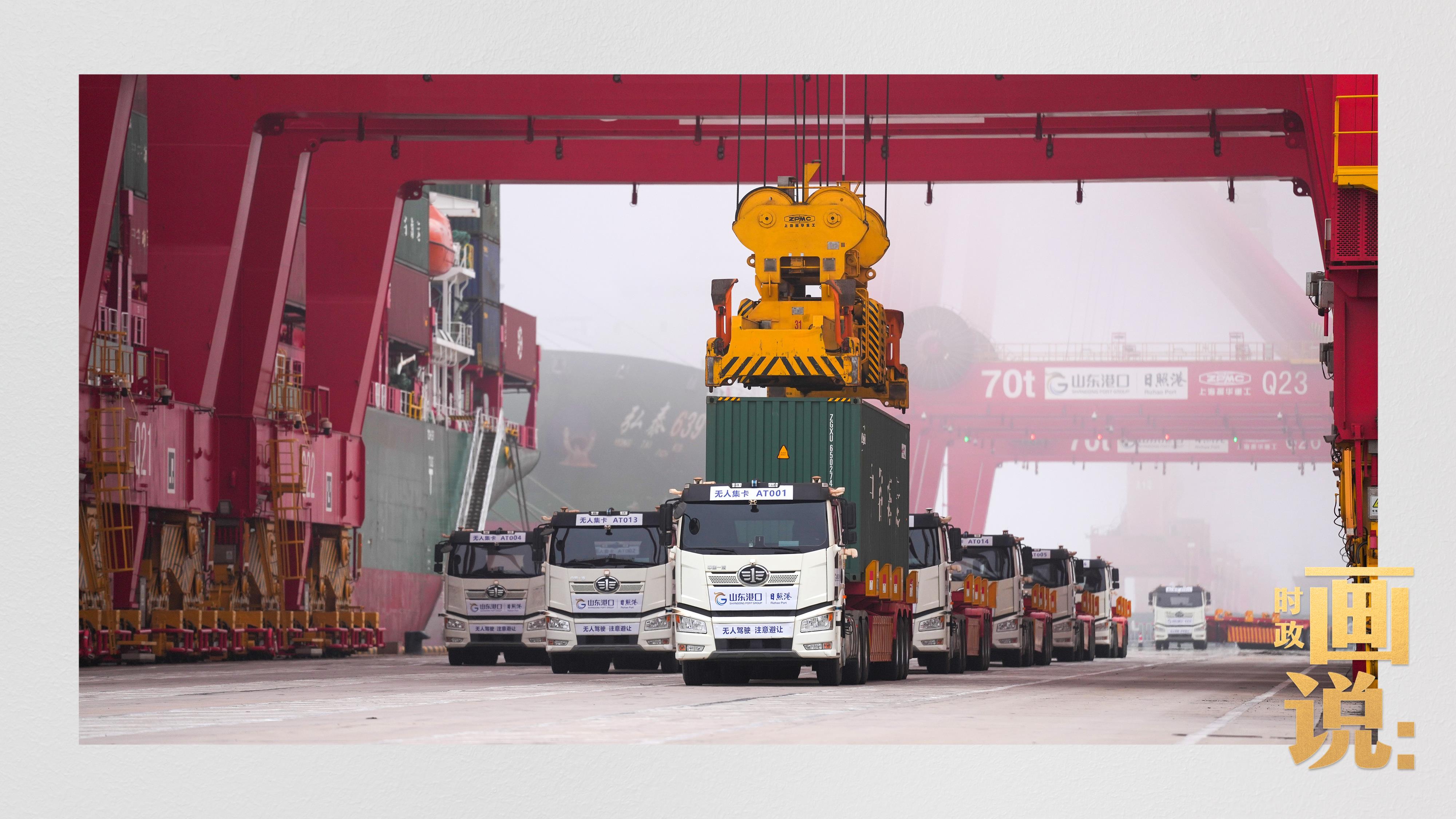 山東港口集團(tuán)日照港順岸開放式全自動(dòng)化集裝箱碼頭,無人集卡車在運(yùn)送集裝箱。