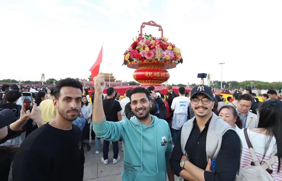 2023年10月1日,三位來自阿爾及利亞的游客在北京天安門廣場(chǎng)“祝福祖國(guó)”巨型花籃前留影。