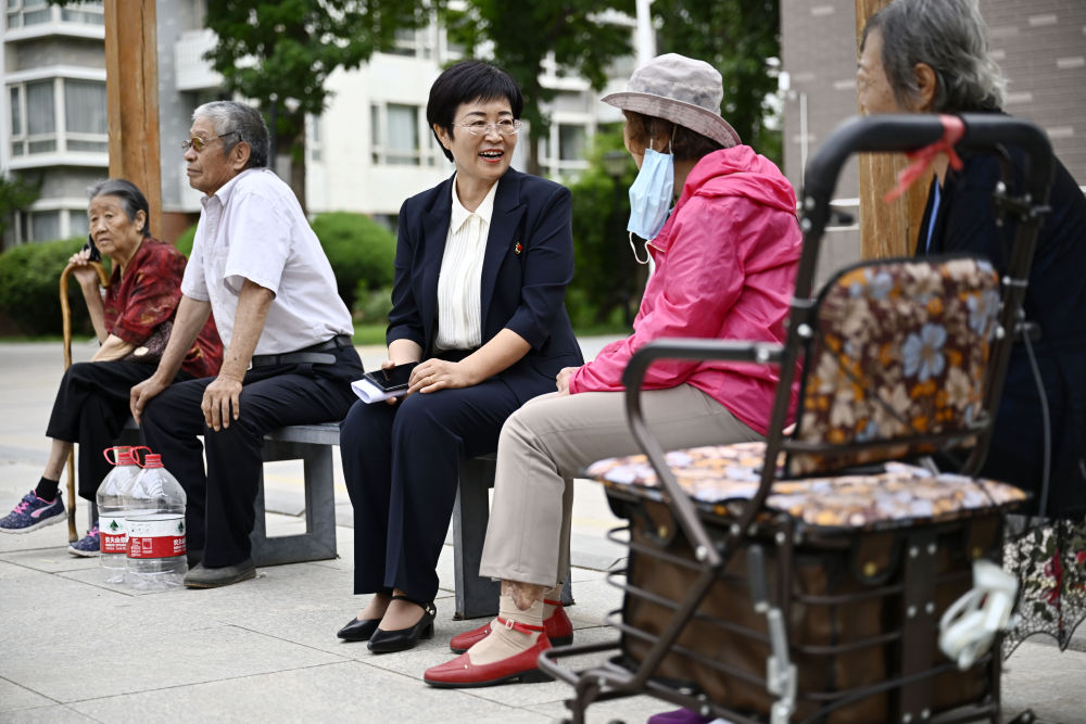 6月20日,寧夏銀川市金鳳區(qū)長城花園社區(qū)黨委書記趙耐香(左三)在社區(qū)廣場與居民交流。