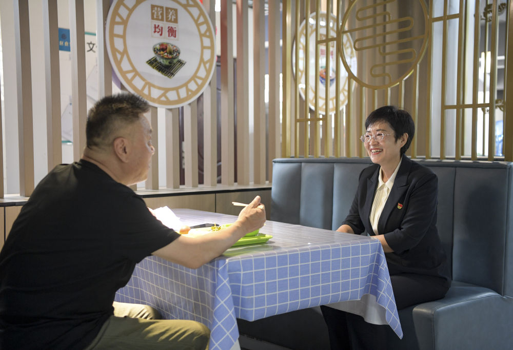 6月20日,寧夏銀川市金鳳區(qū)長城花園社區(qū)黨委書記趙耐香在社區(qū)日間照料中心了解食堂運行情況。