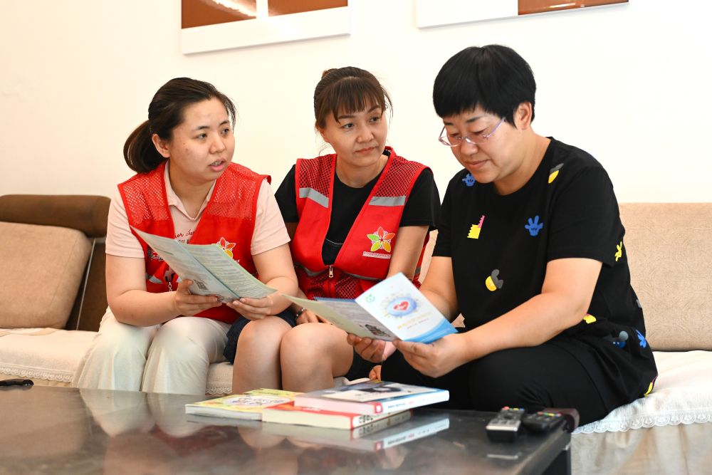 6月20日,寧夏銀川市金鳳區(qū)長城花園社區(qū)志愿者在入戶為居民提供服務。