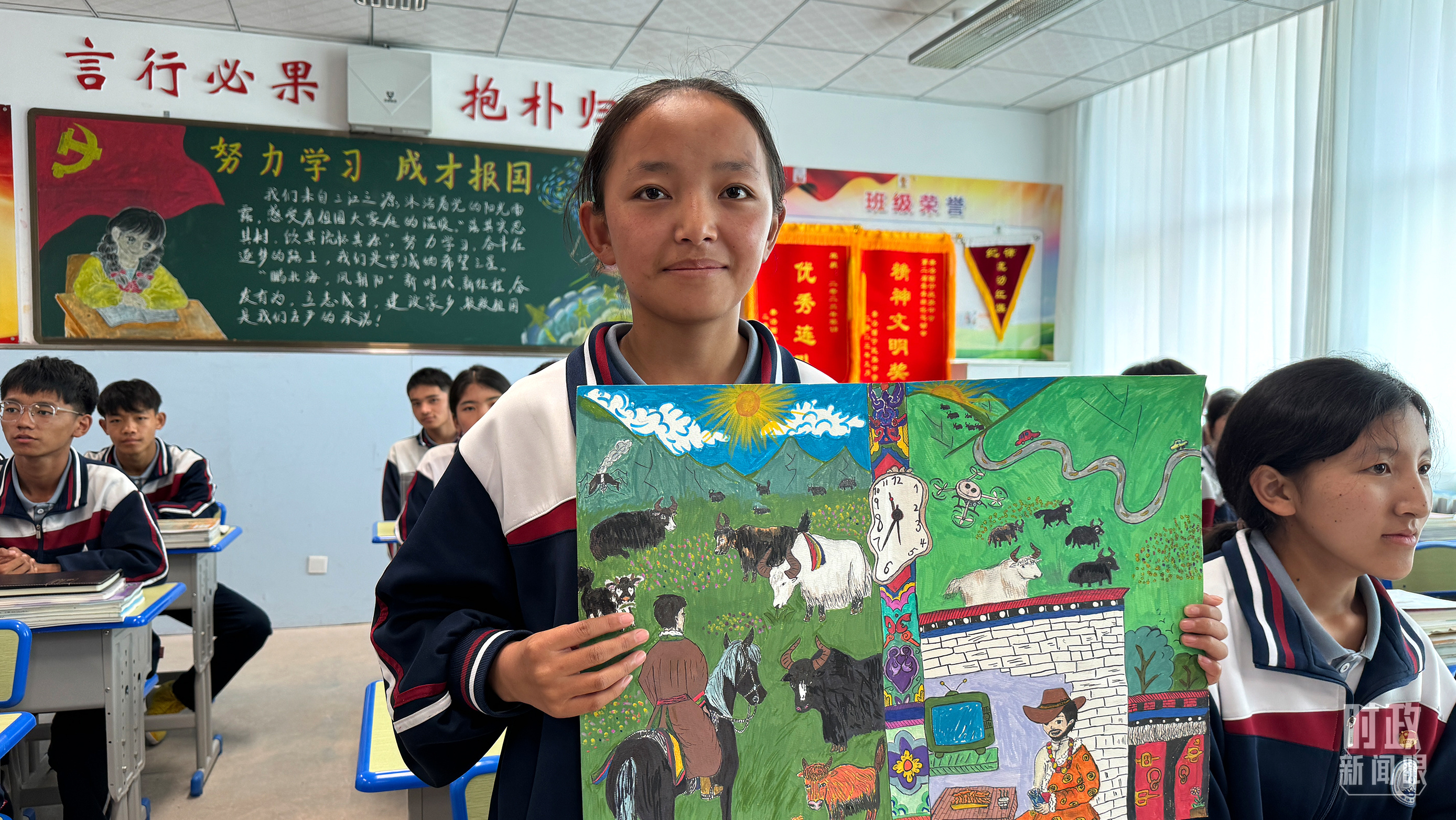 果洛西寧民族中學(xué)高一(1)班的“新時(shí)代、新家鄉(xiāng)”主題思政課。(總臺央視記者段德文拍攝)