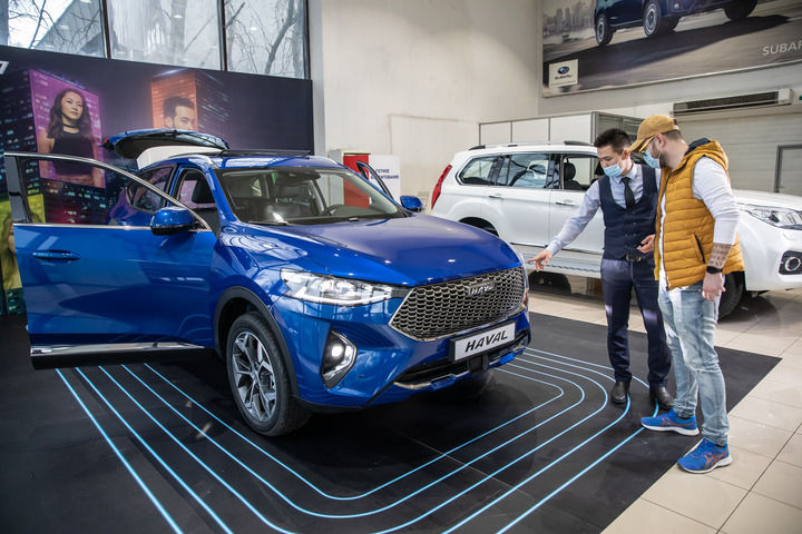 2021年4月1日,銷售人員在哈薩克斯坦阿拉木圖市經(jīng)銷商店向消費者介紹哈弗汽車。