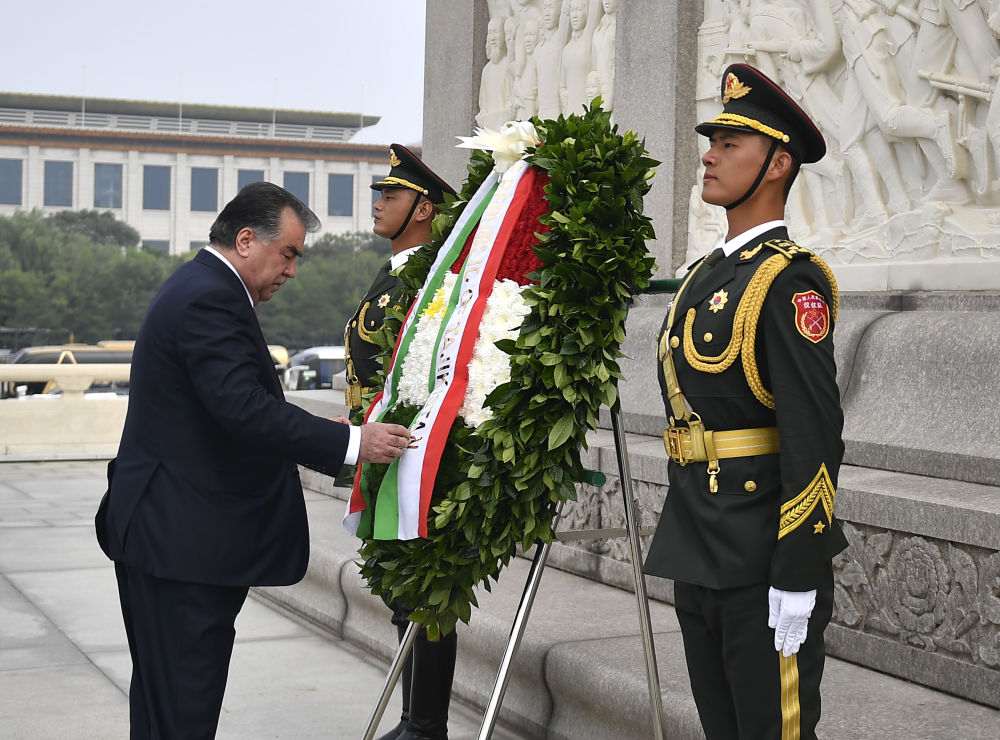 2017年8月31日,塔吉克斯坦總統(tǒng)拉赫蒙前往北京天安門廣場(chǎng),向人民英雄紀(jì)念碑敬獻(xiàn)花圈。