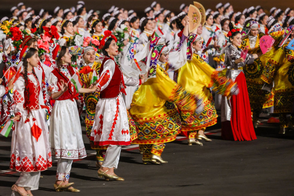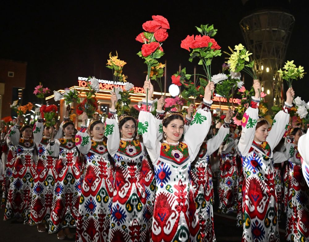 1500多名身著民族盛裝的塔吉克斯坦青年表演富有濃郁特色的中塔歌舞,揮舞中塔兩國國旗,表達對中國最尊貴客人的熱烈歡迎。