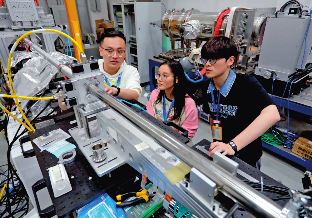 安徽省先進(jìn)功能高分子薄膜工程實(shí)驗(yàn)室團(tuán)隊(duì)成員朱健和(左)在上海同步輻射光源實(shí)驗(yàn)線站向團(tuán)隊(duì)成員講解實(shí)驗(yàn)設(shè)備運(yùn)行情況(2024 年 4 月 10 日攝) 方喆攝 / 《瞭望》新聞周刊