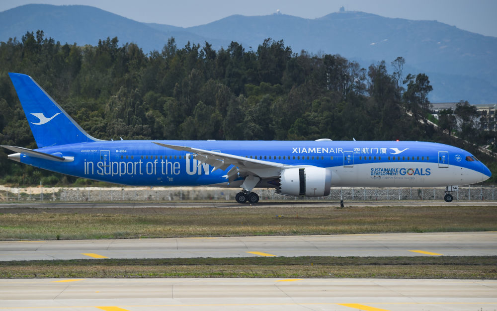 2018年3月21日,聯(lián)合國(guó)特殊涂裝飛機(jī)廈門航空“聯(lián)合夢(mèng)想號(hào)”正式在福建福州長(zhǎng)樂國(guó)際機(jī)場(chǎng)亮相。新華社記者 宋為偉 攝