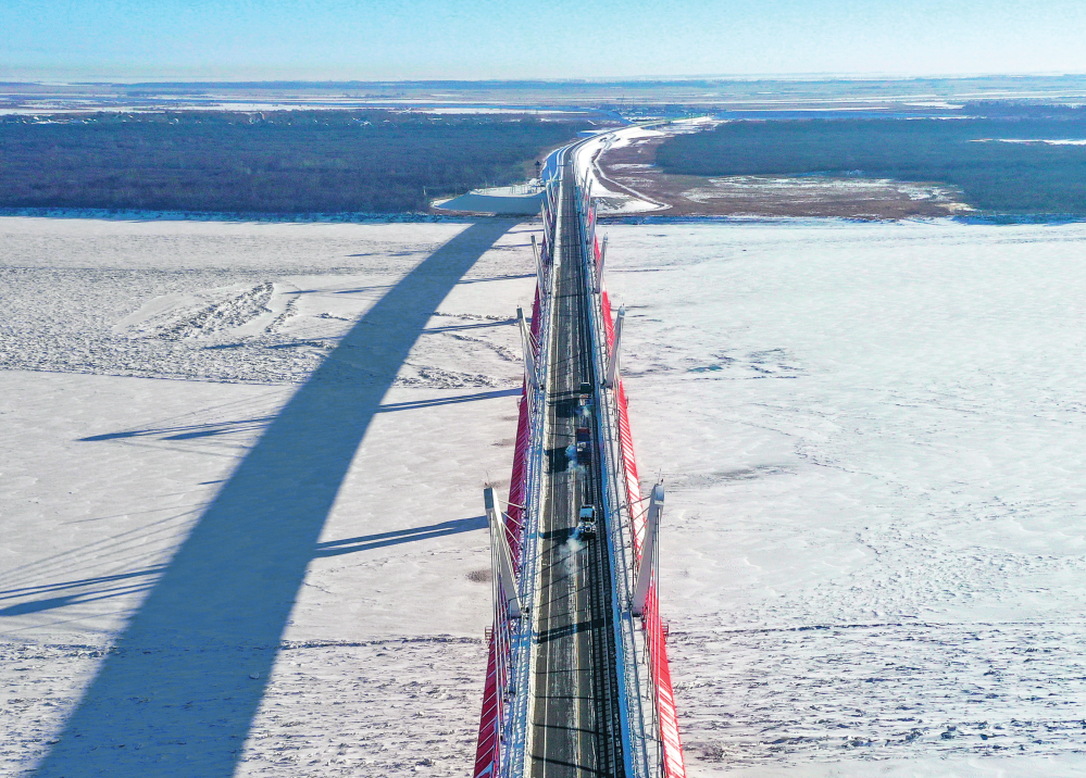 車輛行駛在黑河-布拉戈維申斯克黑龍江大橋上(2024年1月30日攝)。謝劍飛攝/本刊
