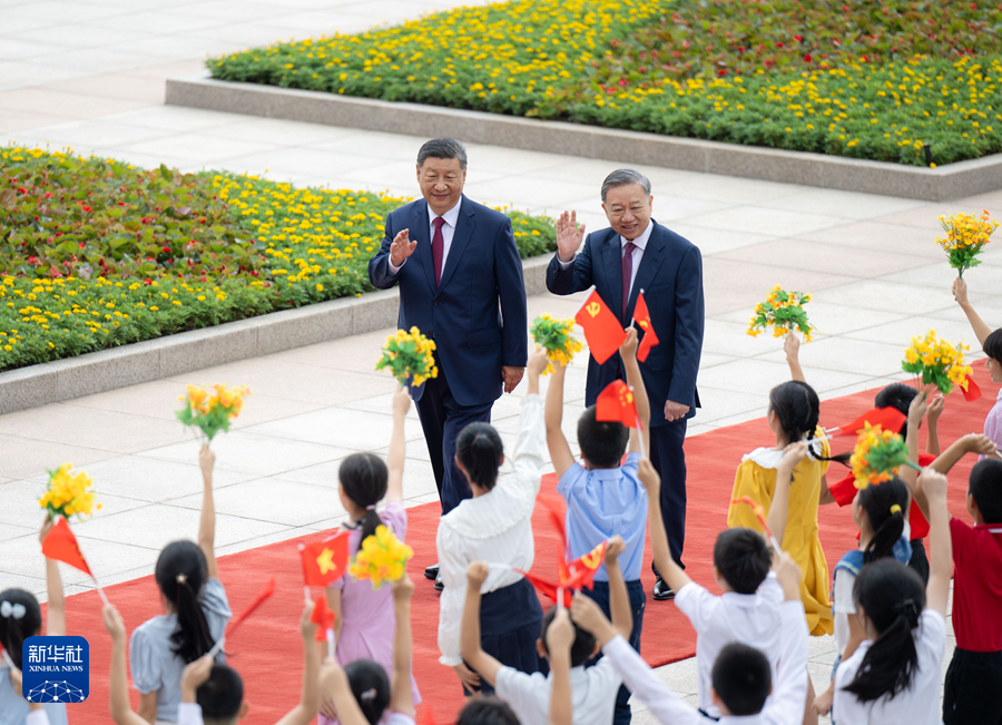 8月19日,中共中央總書記、國(guó)家主席習(xí)近平在北京人民大會(huì)堂同來(lái)華進(jìn)行國(guó)事訪問(wèn)的越共中央總書記、國(guó)家主席蘇林舉行會(huì)談。這是會(huì)談前,習(xí)近平在人民大會(huì)堂東門外廣場(chǎng)為蘇林舉行歡迎儀式。新華社記者 岳月偉 攝